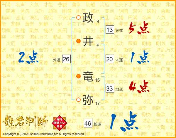 政(9画)井(4画) 竜(16画)弥(17画)