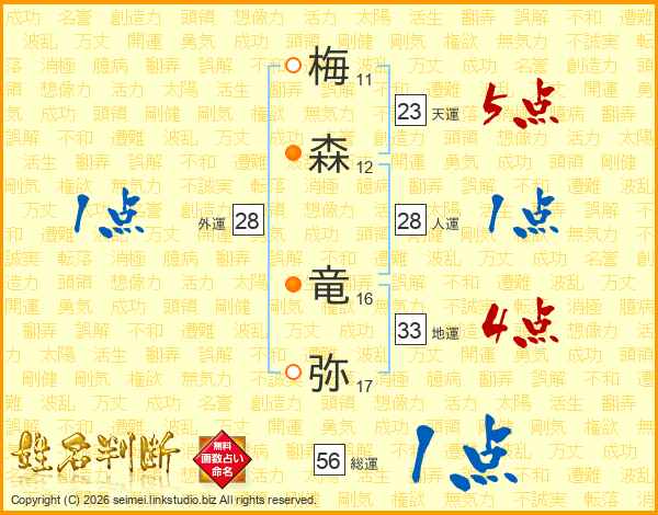 梅(11画)森(12画) 竜(16画)弥(17画)