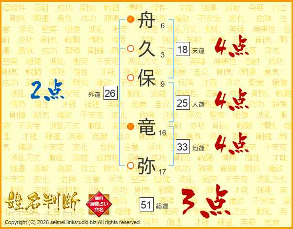舟(6画)久(3画)保(9画) 竜(16画)弥(17画)