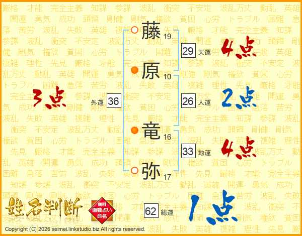 藤原竜弥さんの総運は62画の1点!