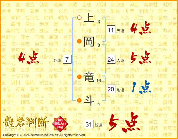上岡竜斗さんの総運は31画の5点!