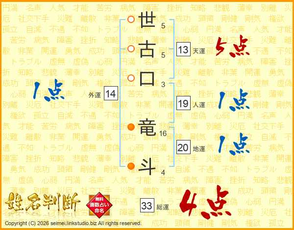 世(5画)古(5画)口(3画) 竜(16画)斗(4画)