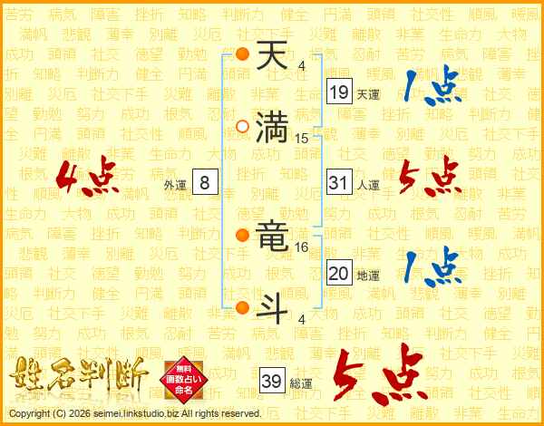 天満竜斗さんの総運は39画の5点!
