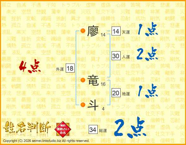 廖竜斗さんの総運は34画の2点!