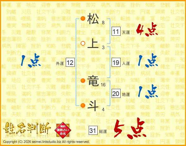 生活面を象徴する運勢です。外部から受ける影響力を表し、結婚運、家庭運や職場、環境への順応性を表します。総運から人運を引いた画数。姓や名が1文字の場合を除く。