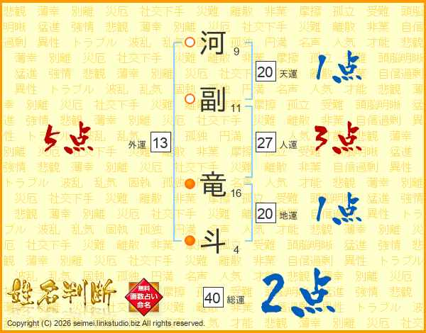 生活面を象徴する運勢です。外部から受ける影響力を表し、結婚運、家庭運や職場、環境への順応性を表します。総運から人運を引いた画数。姓や名が1文字の場合を除く。