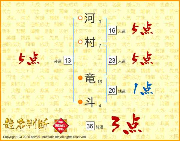 河(9画)村(7画) 竜(16画)斗(4画)