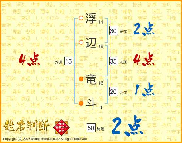 浮(11画)辺(19画) 竜(16画)斗(4画)