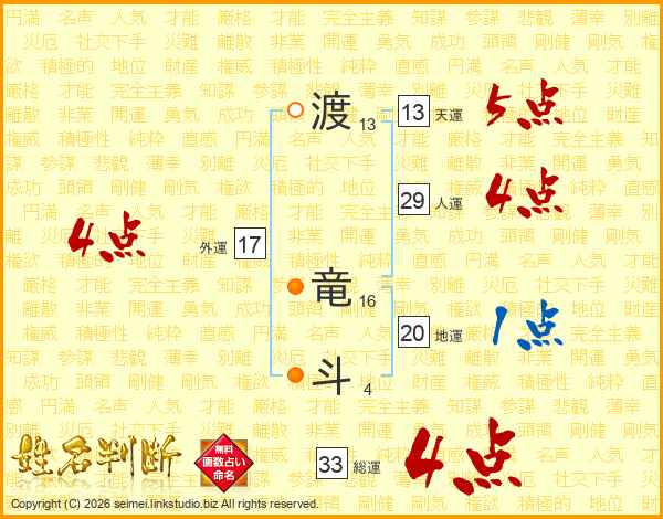 渡竜斗さんの総運は33画の4点!