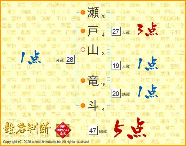 瀬(20画)戸(4画)山(3画) 竜(16画)斗(4画)