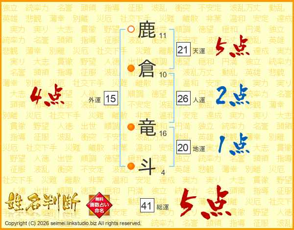 鹿(11画)倉(10画) 竜(16画)斗(4画)