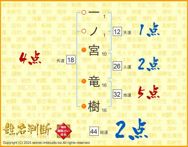 一(1画)ノ(1画)宮(10画) 竜(16画)樹(16画)