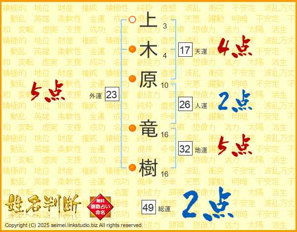 上(3画)木(4画)原(10画) 竜(16画)樹(16画)