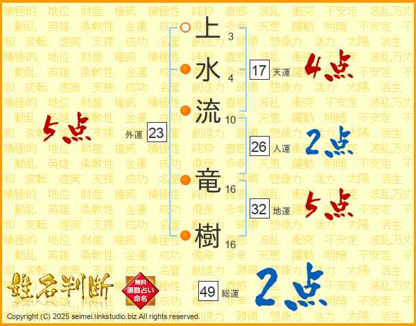 上(3画)水(4画)流(10画) 竜(16画)樹(16画)