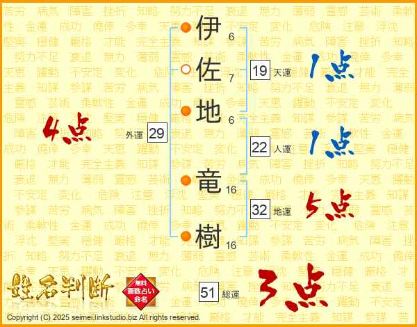 伊(6画)佐(7画)地(6画) 竜(16画)樹(16画)