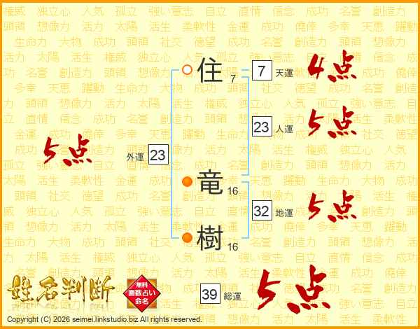 家系が持つ宿命的な運勢を表します。祖先から受け継いだ苗字ですので自分の力が及びません。家柄を象徴します。苗字の合計画数。