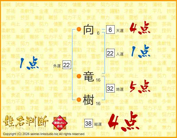 生活面を象徴する運勢です。外部から受ける影響力を表し、結婚運、家庭運や職場、環境への順応性を表します。総運から人運を引いた画数。姓や名が1文字の場合を除く。