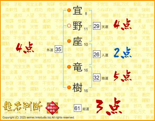 宜(8画)野(11画)座(10画) 竜(16画)樹(16画)