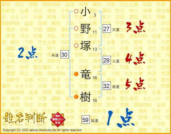 小(3画)野(11画)塚(13画) 竜(16画)樹(16画)