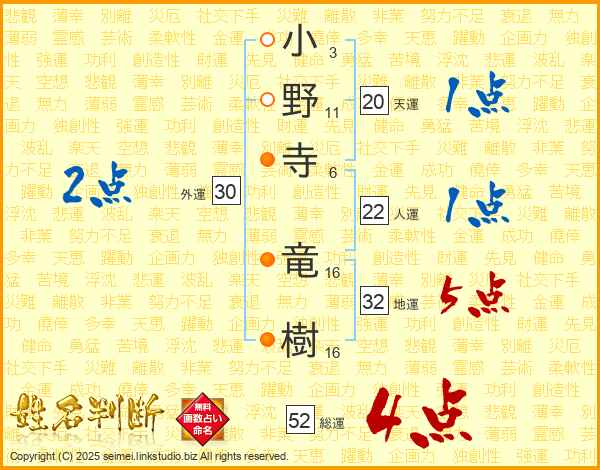 小(3画)野(11画)寺(6画) 竜(16画)樹(16画)