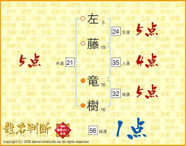左(5画)藤(19画) 竜(16画)樹(16画)