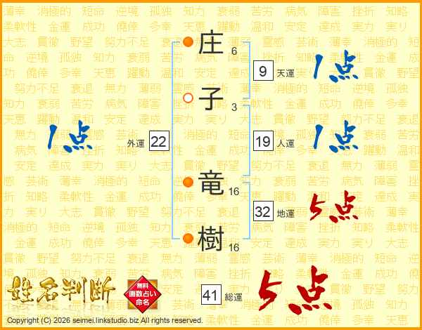庄(6画)子(3画) 竜(16画)樹(16画)