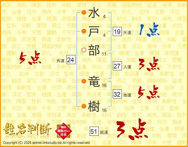 水(4画)戸(4画)部(11画) 竜(16画)樹(16画)
