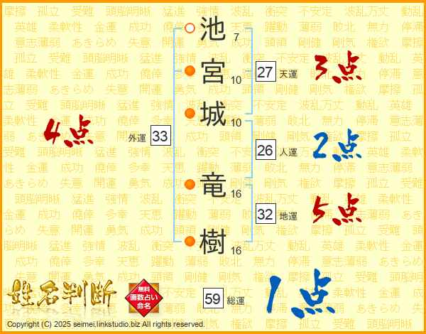 池(7画)宮(10画)城(10画) 竜(16画)樹(16画)