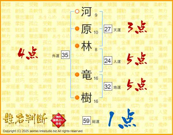 河(9画)原(10画)林(8画) 竜(16画)樹(16画)