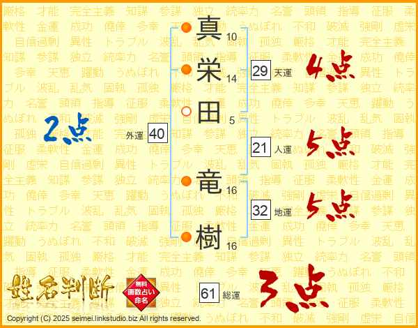 真(10画)栄(14画)田(5画) 竜(16画)樹(16画)