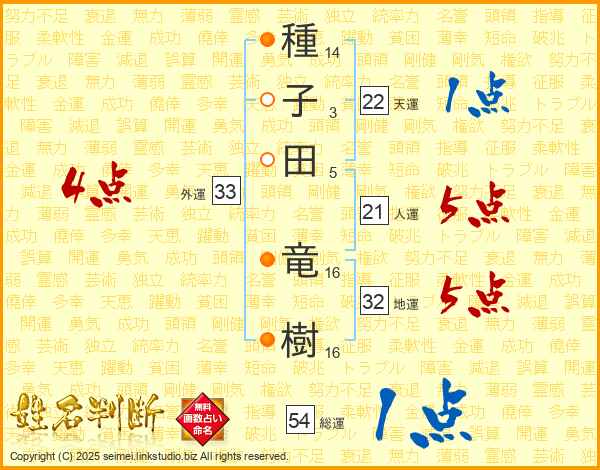 種(14画)子(3画)田(5画) 竜(16画)樹(16画)