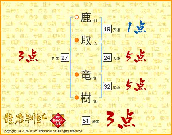 鹿取竜樹さんの総運は51画の3点!