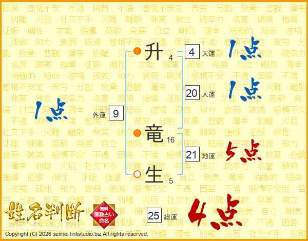 生活面を象徴する運勢です。外部から受ける影響力を表し、結婚運、家庭運や職場、環境への順応性を表します。総運から人運を引いた画数。姓や名が1文字の場合を除く。