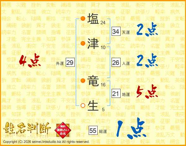 塩(24画)津(10画) 竜(16画)生(5画)