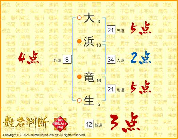大(3画)浜(18画) 竜(16画)生(5画)