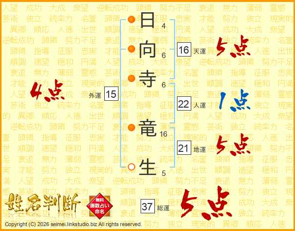 日(4画)向(6画)寺(6画) 竜(16画)生(5画)