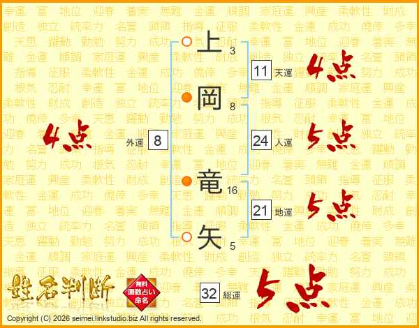 上岡竜矢さんの総運は32画の5点!