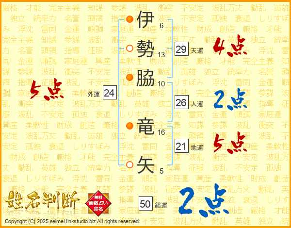 伊(6画)勢(13画)脇(10画) 竜(16画)矢(5画)