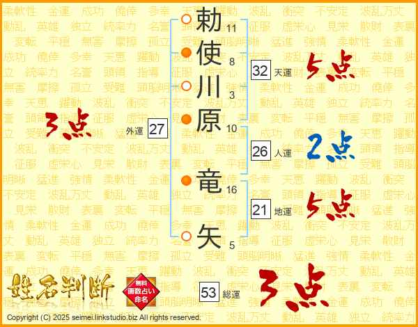 勅(11画)使(8画)川(3画)原(10画) 竜(16画)矢(5画)
