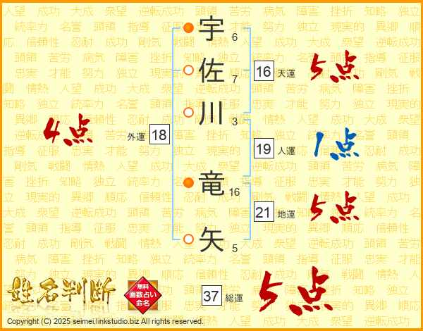 宇(6画)佐(7画)川(3画) 竜(16画)矢(5画)