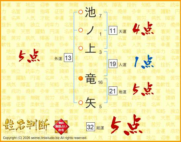 池ノ上竜矢さんの総運は32画の5点!