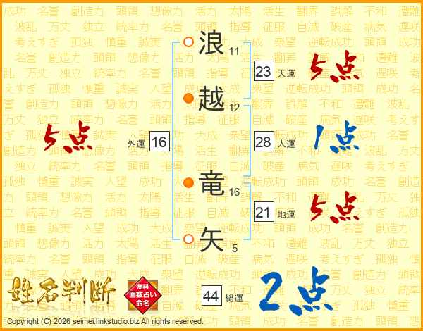 浪(11画)越(12画) 竜(16画)矢(5画)
