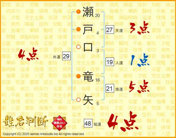 瀬(20画)戸(4画)口(3画) 竜(16画)矢(5画)