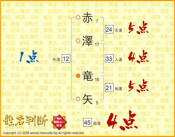 赤(7画)澤(17画) 竜(16画)矢(5画)