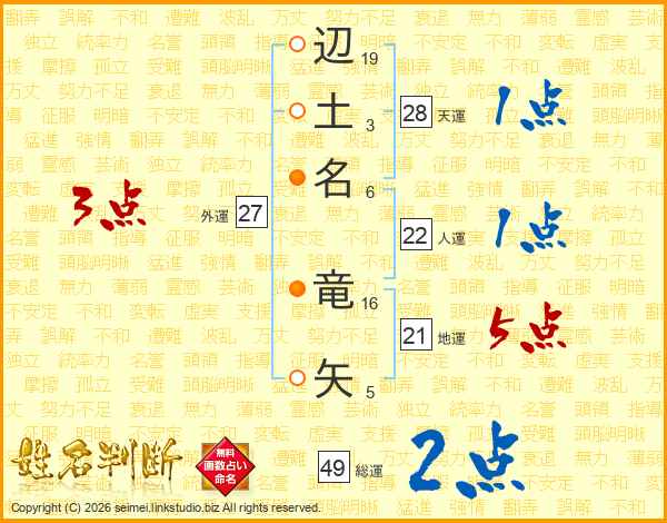 辺(19画)土(3画)名(6画) 竜(16画)矢(5画)