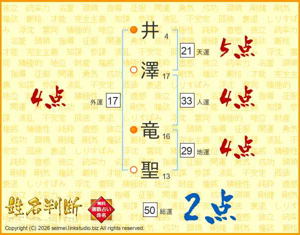 井(4画)澤(17画) 竜(16画)聖(13画)