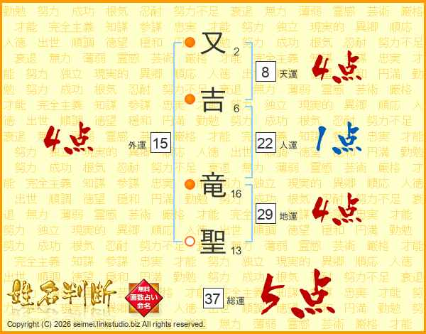 又(2画)吉(6画) 竜(16画)聖(13画)