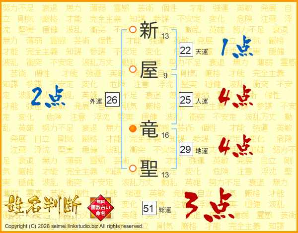 新(13画)屋(9画) 竜(16画)聖(13画)