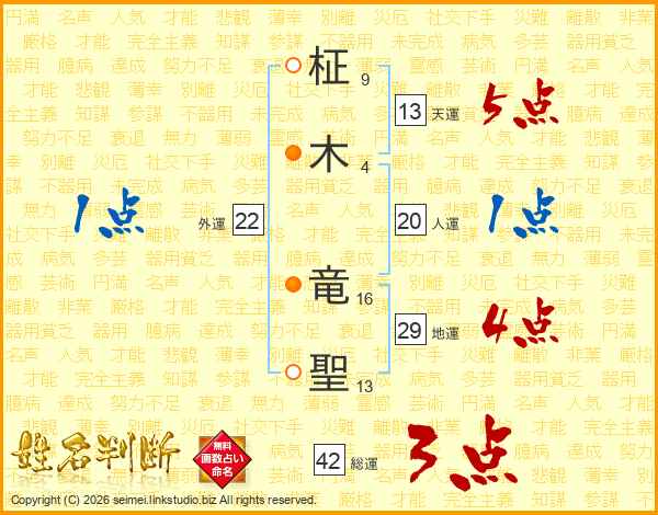 柾(9画)木(4画) 竜(16画)聖(13画)