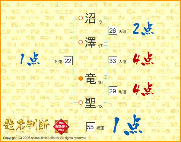 沼(9画)澤(17画) 竜(16画)聖(13画)